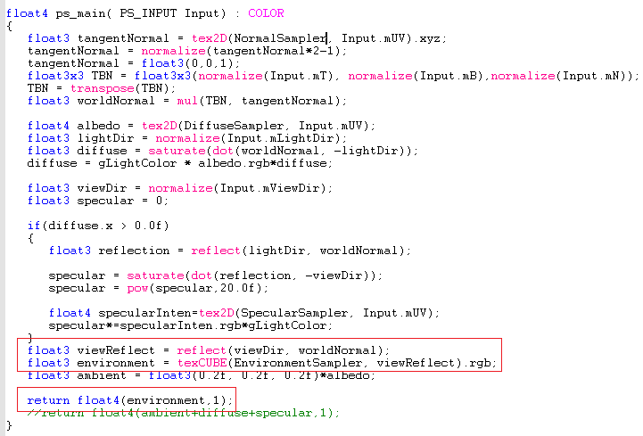 return float4(ambient+diffuse+specular+(environment*0.5f),1);