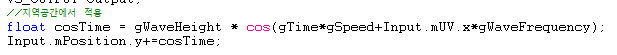 float cosTime = gWaveHeight * cos((gTime*gSpeed)+(Input.mUV.x*gWaveFrequency));