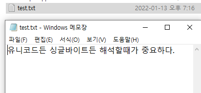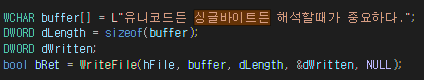 CHAR buffer[] = "유니코드든 싱글바이트든 해석할때가 중요하다.";