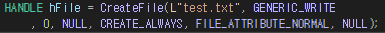 [in] LPCWSTR lpFileName, //만들거나 열 파일 또는 파일의 경로 및 이름