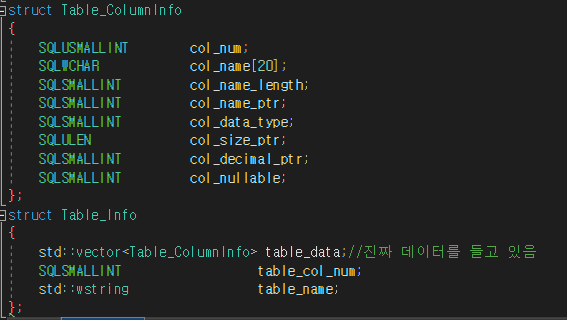 1 2 3 4 5 6 7 8 9 10 11 12 13 14 15 16 17 18 19 20 21 22 23 24 25 26 27 28 29 30 31 32 33 34 35 36 37 38 39 40 | bool KODBC::Execute_TableSet(const TCHAR* tablename) { Table_Info table; table.table_name = tablename; std::wstring statement = L"select * from "; statement += tablename; SQLRETURN ret = SQLExecDirect(handle_stmt, (SQLTCHAR*)statement.c_str(), SQL_NTS); if (ret != SQL_SUCCESS) { Check(); return false; } //결과집합의 콜 열수를 반환함 SQLNumResultCols(handle_stmt, &table.table_col_num); //데이터 베이스는 행이 0이 아닌 1부터 시작함 for (int icol = 1; icol <= table.table_col_num; icol++) { //열 정보 구조체 생성 Table_ColumnInfo column; //행 수 column.col_num = icol; //열 이름 만큼 사이즈 int col_size = _countof(column.col_name); /*SQLDescribeCol 결과 집합의 한 열에 대해 결과 설명자- 열 이름, 형식, 열 크기, 10 진수 숫자 및 null 허용 여부를 반환 합니다. */ SQLDescribeCol(handle_stmt, icol, column.col_name, col_size, &column.col_name_ptr, &column.col_data_type,// 데이터형 &column.col_size_ptr, &column.col_decimal_ptr, // 10진수 자리수 &column.col_nullable);// NULL 허용여부 table.table_data.push_back(column); } } | cs |