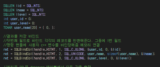 1 2 3 4 5 6 7 8 9 10 11 12 13 14 15 16 17 18 19 20 21 22 23 24 25 26 27 28 29 30 31 32 33 34 35 36 37 38 39 40 41 42 43 44 45 46 47 48 49 50 51 52 53 54 55 56 57 58 59 60 61 62 | } //변수 타입 바인딩 SQLLEN lTemp = 0; TCHAR szData[100][21] = { 0, }; int iData[100]; Table_Record record_data; //모든 열만큼 돌면서 변수 바인딩 for (int iBind = 0; iBind < table.table_data.size(); iBind++) { switch (table.table_data[iBind].col_data_type) { case SQL_WCHAR://문자열 타입일때, case SQL_WVARCHAR: { Table_Field data; data.field_data_type = SQL_UNICODE; ret = SQLBindCol(handle_stmt, iBind + 1, SQL_UNICODE, szData[iBind], sizeof(szData[iBind]), &lTemp); if (ret != SQL_SUCCESS) { Check(); return false; } record_data.record.push_back(data); }break; case SQL_INTEGER: { Table_Field data; data.field_data_type = SQL_INTEGER; ret = SQLBindCol(handle_stmt, iBind + 1, SQL_INTEGER, &iData[iBind], 0, &lTemp); if (ret != SQL_SUCCESS) { Check(); return false; } record_data.record.push_back(data); }break; case SQL_REAL: { Table_Field data; data.field_data_type = SQL_C_FLOAT; ret = SQLBindCol(handle_stmt, iBind + 1, SQL_C_FLOAT, &iData[iBind], 0, &lTemp); if (ret != SQL_SUCCESS) { Check(); return false; } record_data.record.push_back(data); }; } } std::cout << "" << std::endl; } | cs |
