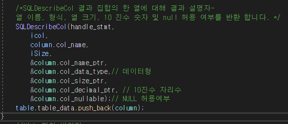 1 2 3 4 5 6 7 8 | //열 총 사이즈 SQLNumResultCols(handle_stmt, &총 열수); for (int 열위치 = 1; 열위치<= 총 열수; 열위치++) { SQLDescribeCol(열위치) } | cs |