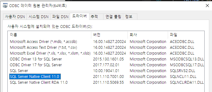 설치가 완료되면 ODBC 관리자에서 SQL Server 드라이버를 확인 할 수 있다.
