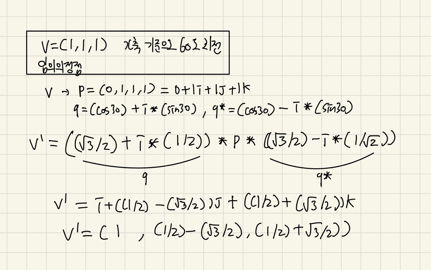 임의의 점 v(1,1,1) 60도 회전 공식 적용 예시