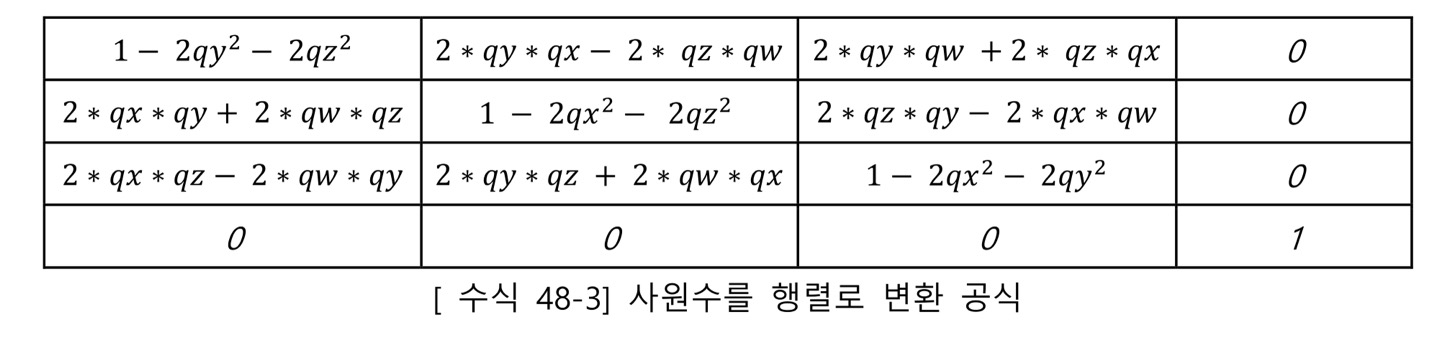 아래는 유도된 사원수-> 행렬 변환 공식이다.