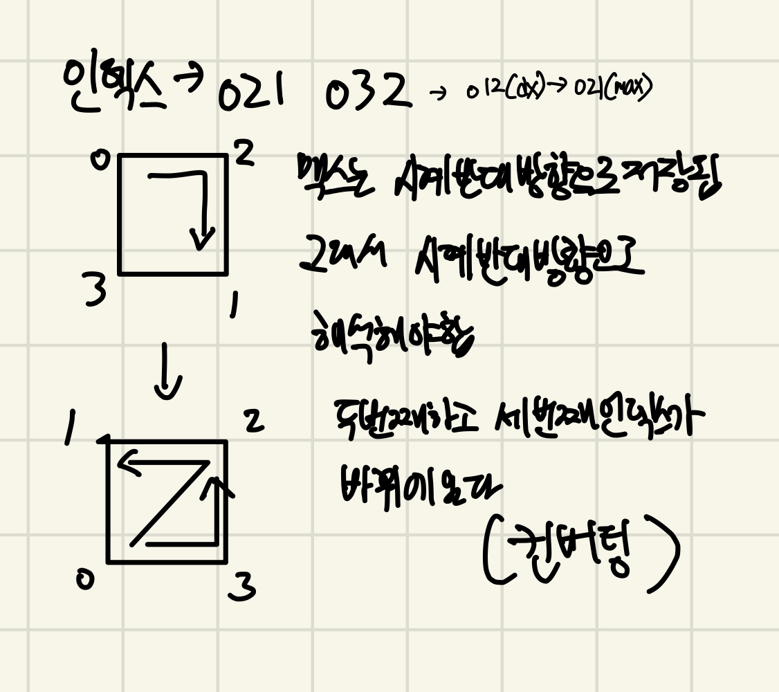두 번째 하고 세 번째 인덱스가 바뀌어 있다. 또한 맥스는 X, Z, Y로 저장되어 있다.